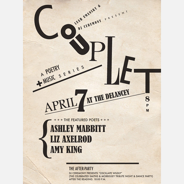 Poster design for COUPLET, a quarterly poetry and music salon in NYC. This piece draws on early 20th-century Futurist design principles—fragmented text, dramatic diagonals, and typographic experimentation—to evoke the dynamism of the event. An intentionally off-kilter layout mirrors the energy of the live performances and creative collisions.